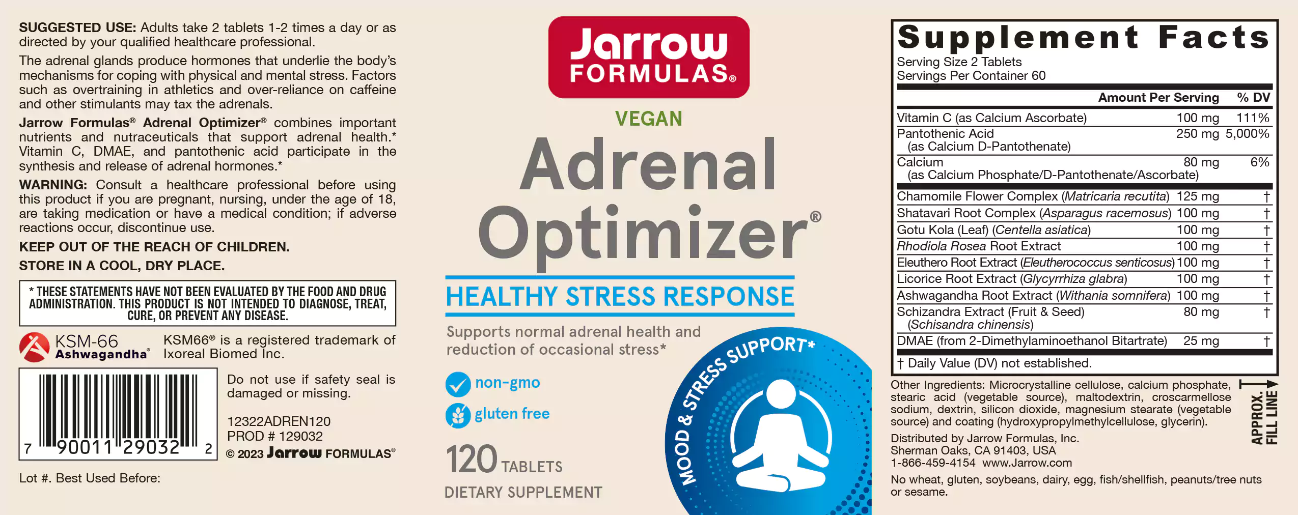 Recurrent increases in stress levels, both from psychological and physiological sources, can result in excess cortisol production, leading to a disrupted homeostasis and directly affecting the HPA axis, nervous system, and an array of other body systems. Adrenal Optimizer ® helps combat these effects by offering a blend of renowned herbal adaptogens and essential nutrients for complete stress support and adrenal renewal, as well as increased energy and endurance.In addition to the stress-fighting compounds in key ingredients, such as Eleuthero and Rhodiola rosea , Jarrow Formulas’ Adrenal Optimizer contains KSM-66, the high-concentration Ashwagandha extract. Using only the roots of the ashwagandha plant, extracted in an alcohol and chemical free process, KSM-66 has been clinically shown to ease short-term stress, promote normal levels of inflammation, promote a healthy outlook, support cognitive health, and increase physical endurance.