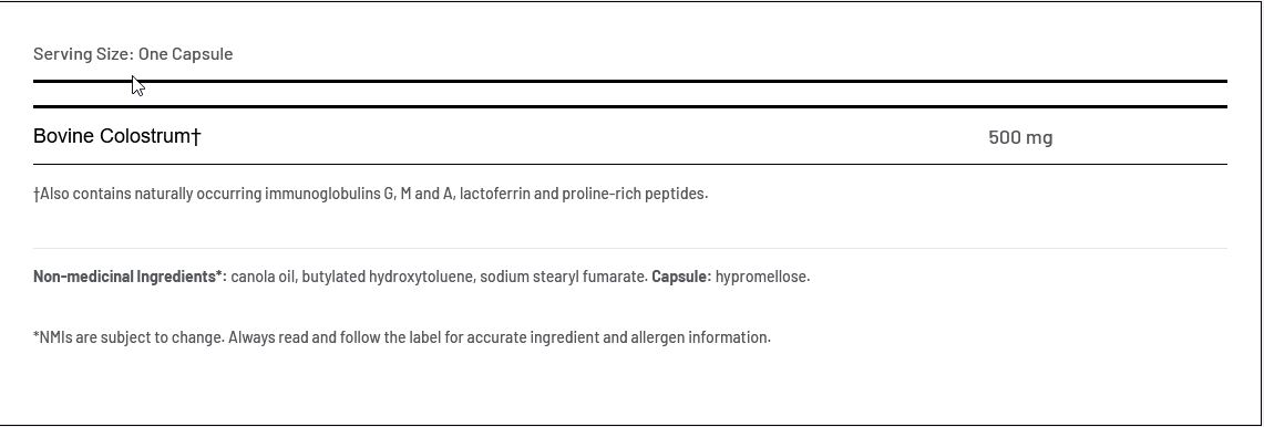 active ingredient (colostrum from milk), filler (canola oil, butylated hydroxytoluene, sodium stearyl fumarate), capsule (hypromellose)