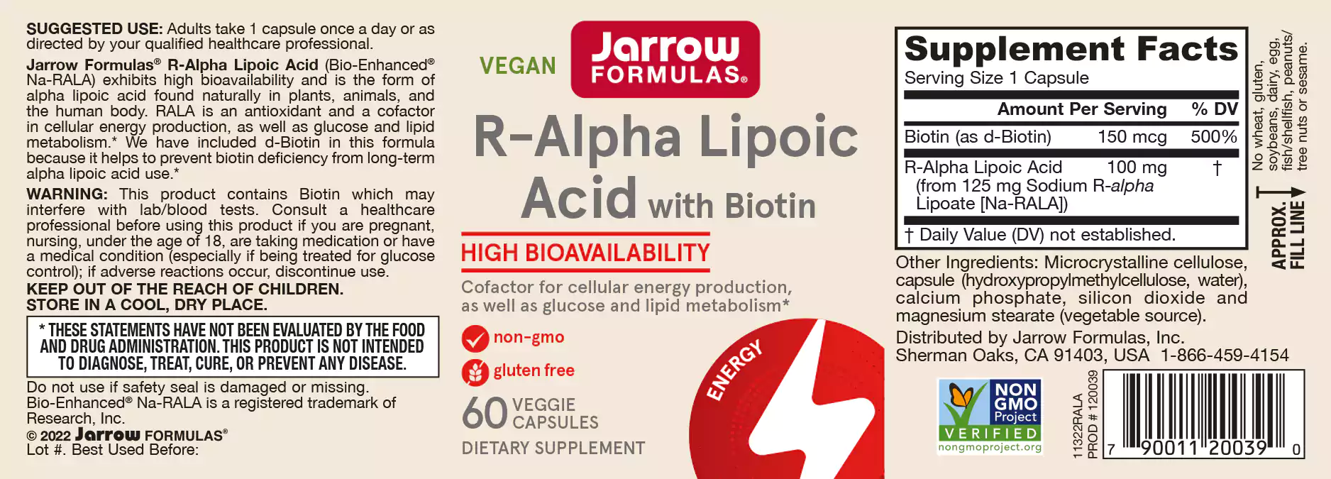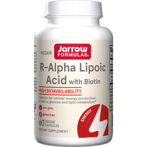 Jarrow Formulas R-Alpha Lipoic Acid w biotin is a unique lipid and water soluble antioxidant that is a co-factor in energy production, helping to regulate glucose metabolism. ALA also promotes the synthesis of glutathione. Biotin is added for optimum ALA activity.