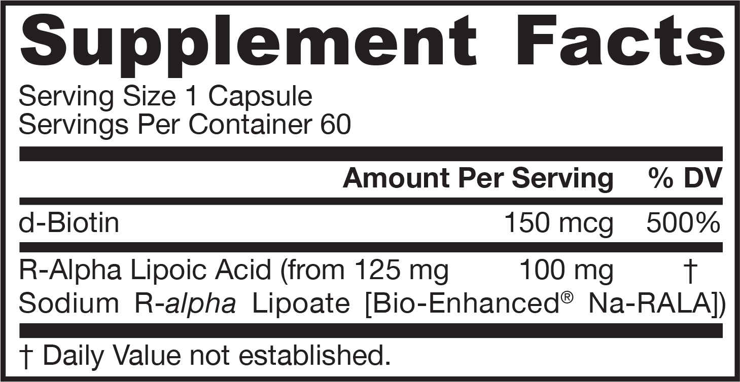 Biotin (B7) is a water soluble B-complex vitamin and serves as a cofactor for many enzymes including pyruvate carboxylase, acetyl-CoA carboxylase, propionyl-CoA carboxylase, and 3-methylcrotonyl-CoA carboxylase. These enzymes play critical roles in mammalian gluconeogenesis, fatty acid synthesis, propionate metabolism, and the catabolism of leucine. Thus, biotin supplementation, along with R-ALA, will further support healthy metabolism and energy production.