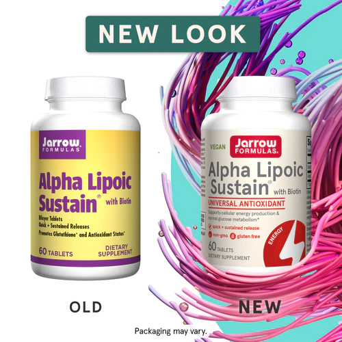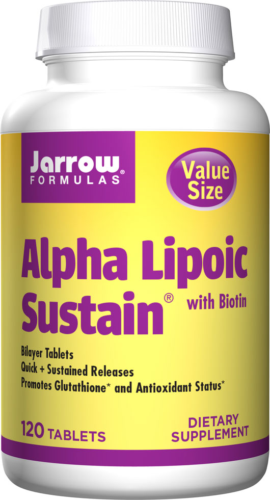 Alpha Lipoic Sustain 300 is available as a sustained release format so as to minimize gastric irritations and blood sugar fluctuations. Alpha Lipoic Acid is a disulfide molecule (containing two thiol groups). A thiol (or -SH) consists of a sulfur and a hydrogen atom. This unique anti-oxidant is both lipid- and water-soluble, a potent promoter of glutathione synthesis and a co-factor in energy production, helping to regulate glucose metabolism. Jarrow Formulas Alpha Lipoic Acid is made in Europe. Biotin is added for optimum ALA activity.