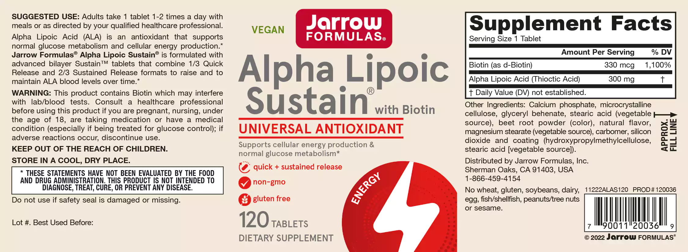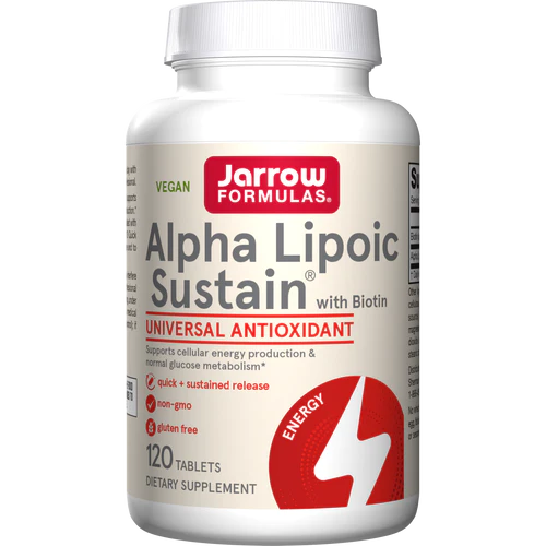 Jarrow Formulas Alpha Lipoic Sustain 300mg 120 tablets is a unique lipid and water soluble antioxidant that is a co-factor in energy production, helping to regulate glucose metabolism. ALA also promotes the synthesis of glutathione. Biotin is added for optimum ALA activity.