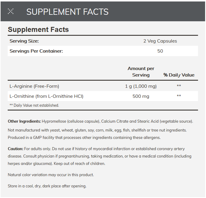 active ingredient (L-arginine, L-ornithine), v-capsule (hypromellose), filler (calcium citrate, vegetable stearic acid)