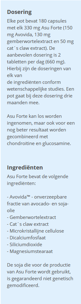 The main ingredient in ASU Forte is ASU, which is a special extract of avocado and soybean oil (AvoVida). The abbreviation ASU stands for Avocado Soy Unsaponifiables. This ingredient promotes collagen formation, which contributes to cartilage strength.