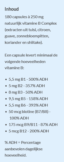 The B-vitamins we derive from food are used for energy production, amino acid metabolism and healthy cell replication. Supplements with B-vitamins are nearly always produced from synthetical sources. These synthetical vitamins are mostly not identical with the natural vitamins present in natural food. These synthetic vitamins are also absorbed and metabolised differently in the human body.