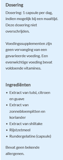 active ingredients (extracts from Tulsi, lemon, guave, sunflower kernels, coriander and shiitake), filler (rice starch), capsule (bovine gelatin)
