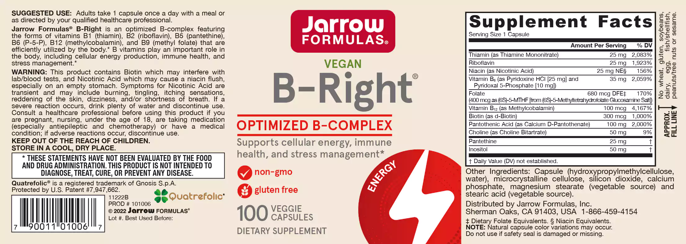 Jarrow Formulas B-RIGHT should be used as a dietary supplement to meet requirements in the case of fatigue, deficiency of B-vitamins or in case of a high protein consumption ( > 0.8 g per kg bodymass).
