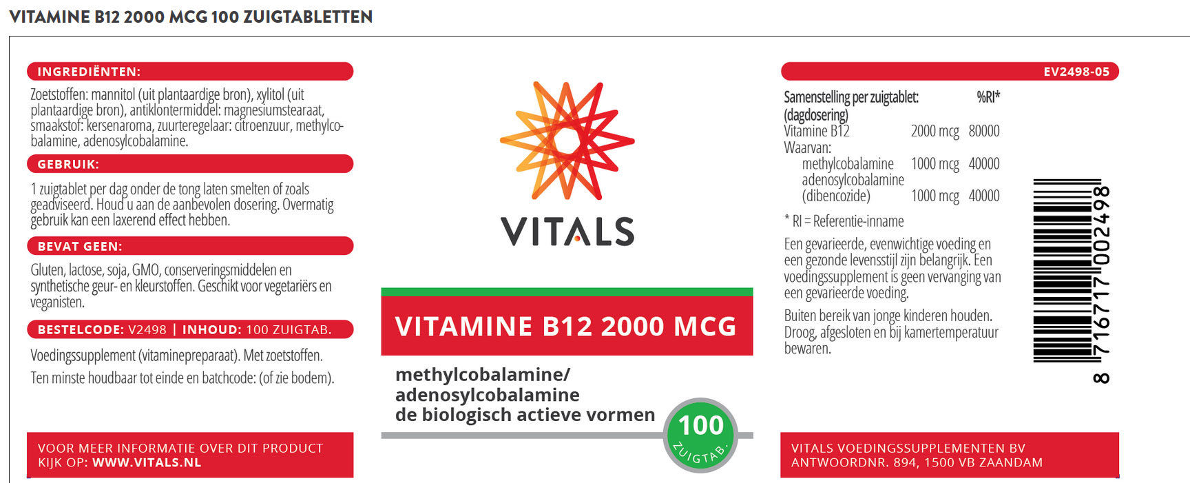 Vitals B12 1mg capsules / 2mg lozenges contain two forms of cobalamine (vitamin B12), viz. methyl- and adenosylcobalamine.
