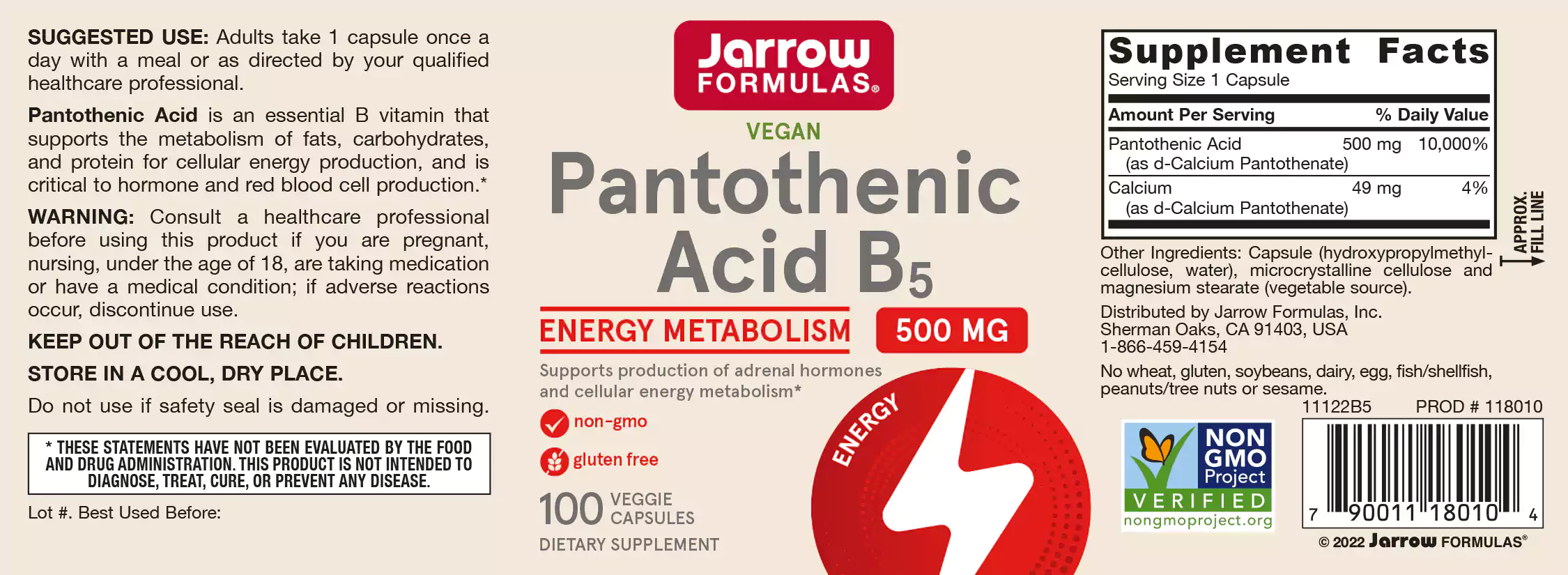 Jarrow Formulas Pantothenic Acid is a member of the B vitamin family and essential for the production of energy (Krebs cycle), the synthesis of adrenal hormones, protein metabolism and wound healing.