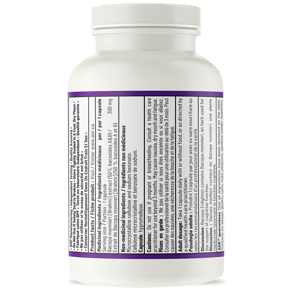 AOR Bacopa Enlighten is Bacopa monniera Linn, a herb used in traditional Ayurvedic medicine for support of cognitive function. Recent science supports this role along with powerful neuroprotective effects through the upregulation of the brain's own antioxidant defense enzymes.