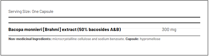 active ingredient (Bacopa monniera extract), filler (microcrystalline cellulose) , capsule (hydroxypropylmethylcellulose, water)