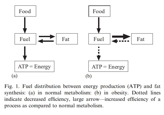On the right is the "obese" metabolism. The primary differences here are the dotted arrows. The food consumed is turned into fuel, but very little of that fuel is converted into energy. Most of it is instead shuttled into fat storage, and because the metabolism is so inefficient, the stored fat is not released and burned for energy.