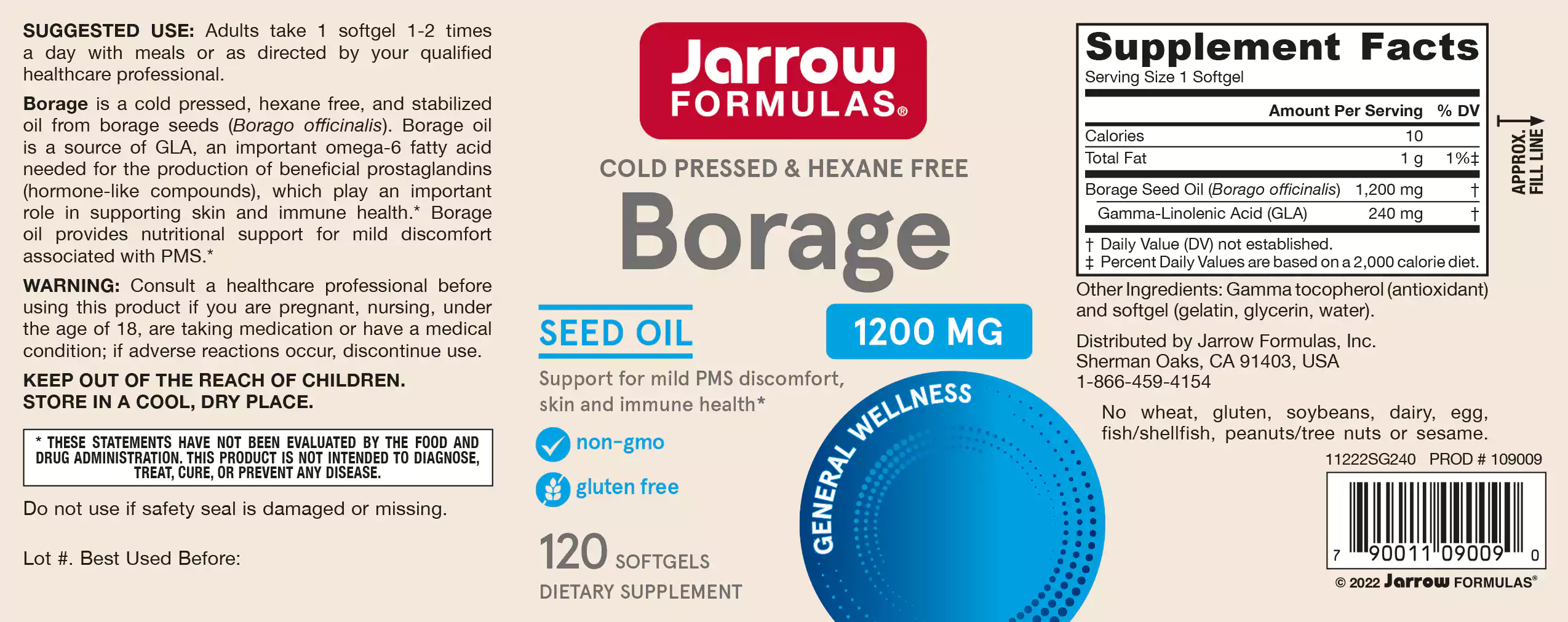 Jarrow Formulas Borage GLA-240 is cold pressed oil from borage seeds. Borage Oil is the highest-potency source of gamma linoleic acid (GLA) available.