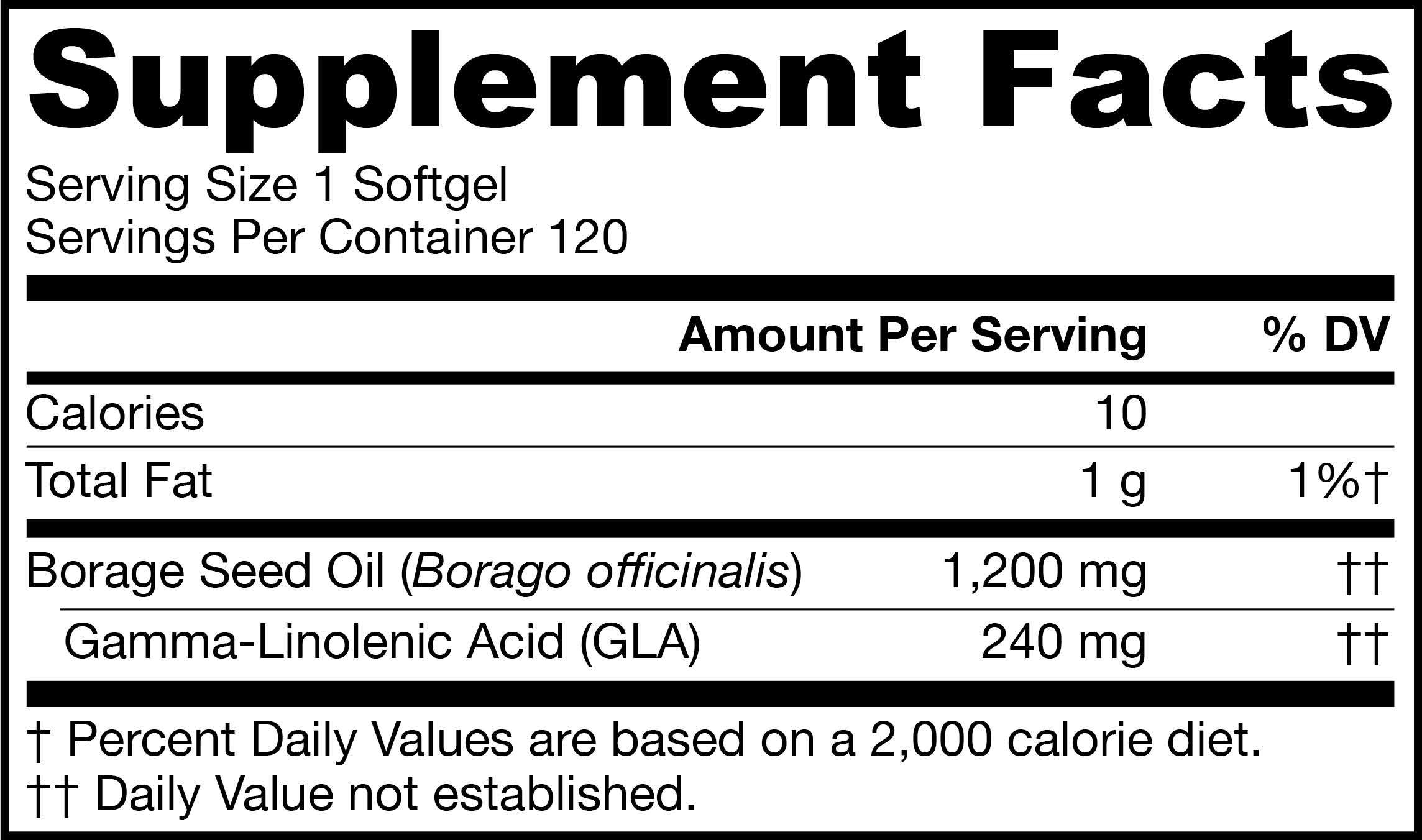 Borage oil is the highest-potency source of GLA available. GLA is an important omega-6 fatty acid needed for the production of beneficial prostaglandins (hormone-like compounds), which play an important role in promoting healthy skin and immune function.