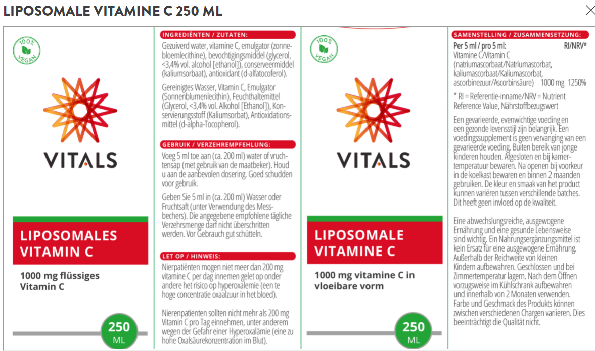Liposomal Vitamin C from Vitals contains 1000 mg of liposomal vitamin C per 5 ml of liquid, in three different forms (sodium ascorbate, potassium ascorbate and ascorbic acid). Liposomes are fat globules with a phospholipid bilayer, within which the active substance is located. Cell membranes also consist of a phospholipid bilayer, which allows the active substances from the liposomes to be optimally absorbed into the cell.