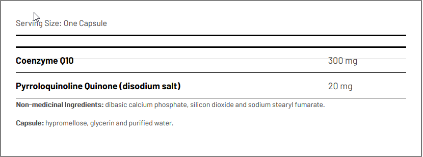active ingredients (co-Q10 (ubiquinone), Pyrroloquinoline Quinone), filler (dibasic calcium phosphate), anticoagulant (silicon dioxide), filler (sodium stearyl fumarate), capsule (hypromellose)