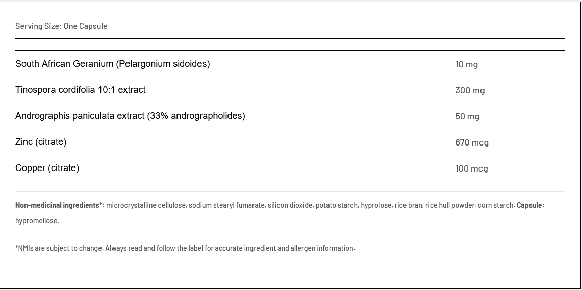 active ingredients (Tinospora cordifolia extract, Andrographis paniculata extract, South African geranium, zinc citrate, copper citrate), filler (microcrystalline cellulose,sodium stearyl fumarate), anticoagulant (silicon dioxide), filler (potato starch, hyprolose, rice bran, rice hull powder, corn starch), v-capsule (hypromellose)