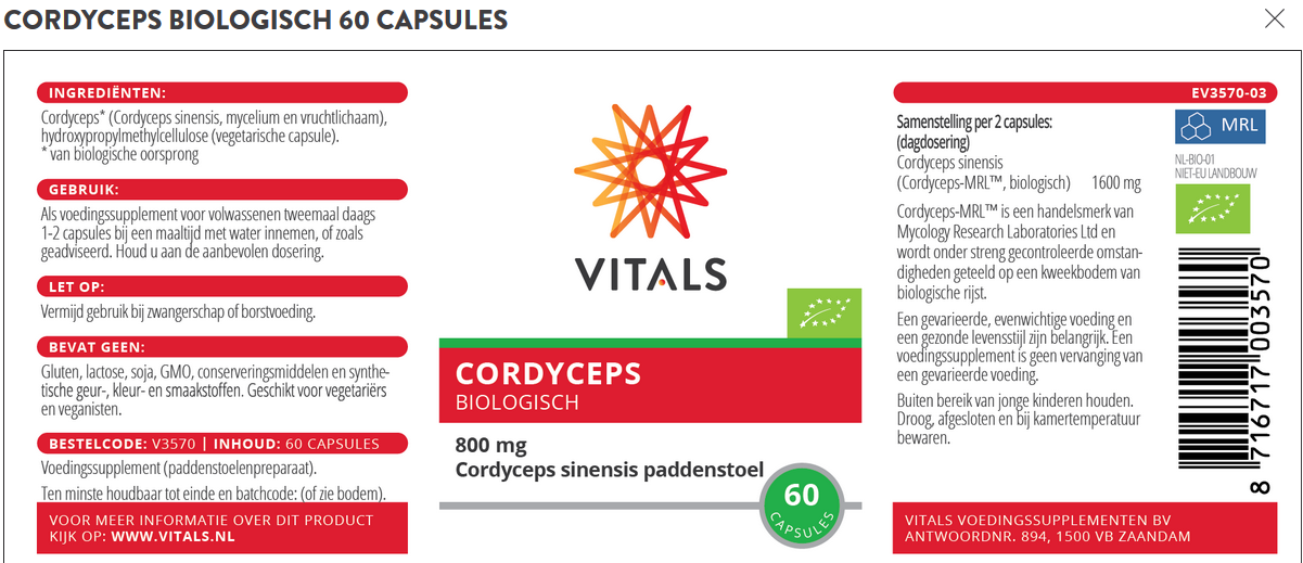 Vitals Organic Cordyceps sinensis is a fungus that is traditionally used in Chinese herbal medicine. Vitals Cordyceps Cs-4 is cultivated in the USA in an isolated, sparsely populated and very clean area. The cultivation of Cordyceps occurs in sterile spaces on a bed of rice. Organic Cordyceps consists of mycelium of the funghi that have the highest concentration of phytonutrients and is similar to the traditional Chinese Cordyceps. The biomass of the entire growing medium and mycelia in this product provide a broad spectrum of physiologically active compounds.