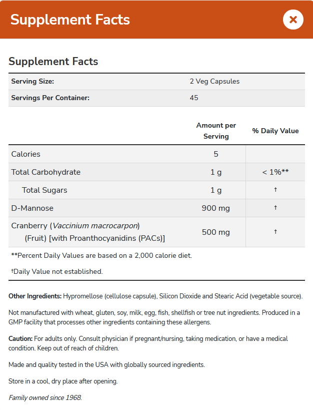 active ingredients (D-mannose, cranberry extract), capsule (hydroxypropyl cellulose), anti-coagulant (silicon dioxide), filler (vegetable stearic acid)