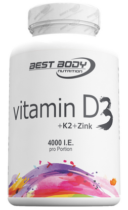 The Vitamin D Tabs from Best Body Nutrition contain an optimally balanced mix of vitamin D3, vitamin K2 and zinc. A sufficient supply of vitamin D is important for the bones and muscles. One tablet contains 4000iu per portion.