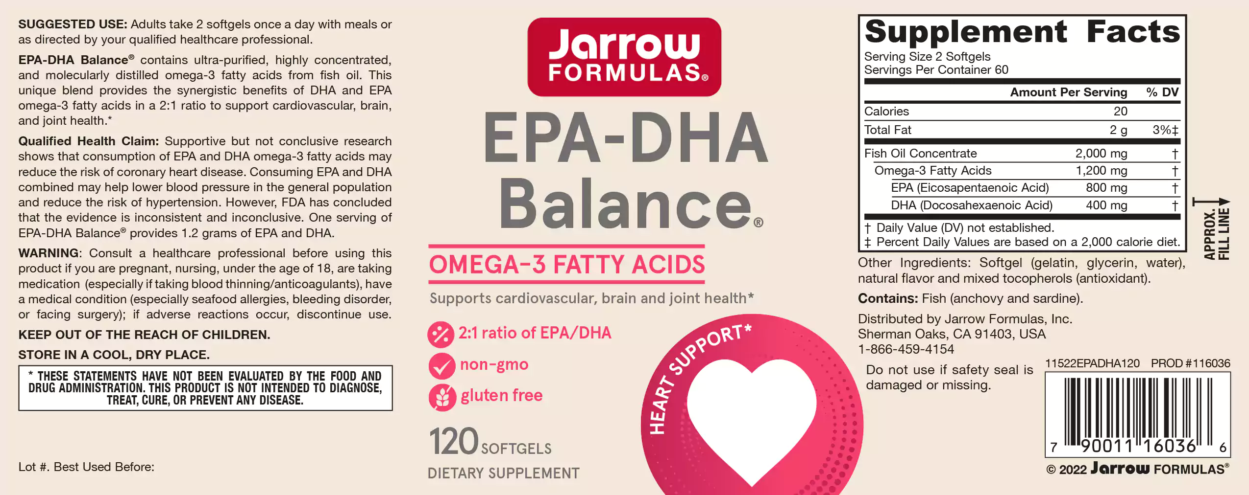 Jarrow Formulas EPA-DHA Premium Balance contains pharmaceutical grade, ultra- purified and highly concentrated omega-3 fatty acids from fish oil.