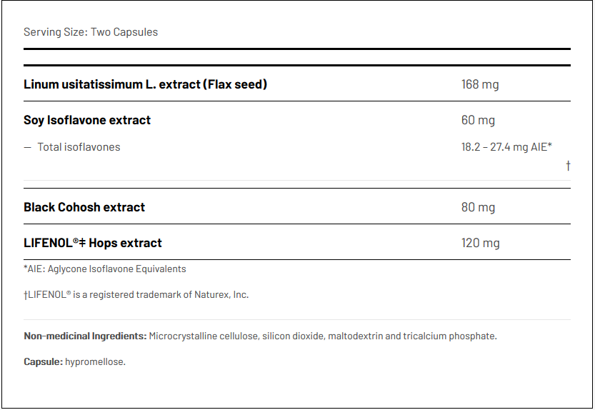 Many women turn to conventional hormone therapies (HRT) to manage physical difficulties experienced during menopause. Unfortunately some of the therapies and medications have undesirable side effects. Studies have shown that plant- based estrogen-like compounds (phytoestrogens) such as lignans, genistein and 8-prenylnaringenin (8PN) have direct effects on some of the hormonal pathways that are involved in menopausal symptoms