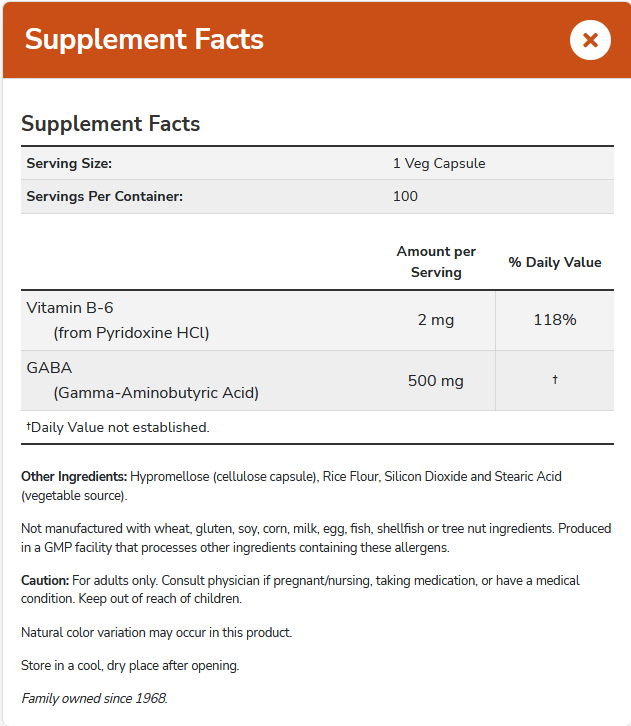 active ingredients (gamma-aminobutyric acid, pyridoxine HCl), v-capsule (cellulose/hypromellose), filler (rice flour), anticoagulant (silicon dioxide), filler (vegetable stearic acid)