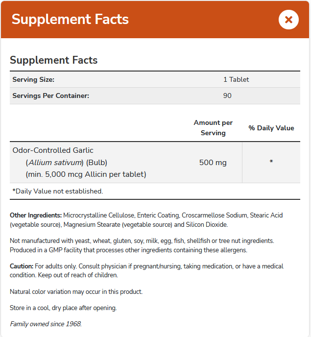 This garlic product is standardized to yield allicin and allicin precursors, which convert to allicin when ingested. It is enteric coated so that this conversion occurs in the upper intestine for optimal absorption, while it avoids the release of garlic’s pungent odor in the stomach. Allicin precursor levels are achieved through a special process that keeps garlic’s moisture low. This process maintains allicin precursors while preserving all of the natural goodness of whole fresh garlic. Enjoy the benefits of this odor-controlled garlic tablet!