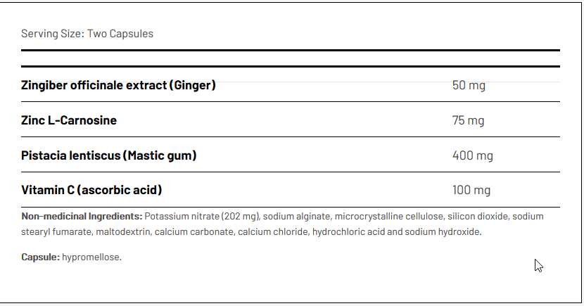active ingredients (mastic gum, potassium nitrate, ascorbic acid, zinc carnosine, ginger), filler (sodium alginate, microcrystalline cellulose, sodium stearyl fumarate, sodium alginate), anticoagulant (silicon dioxide), capsule (hypromellose)