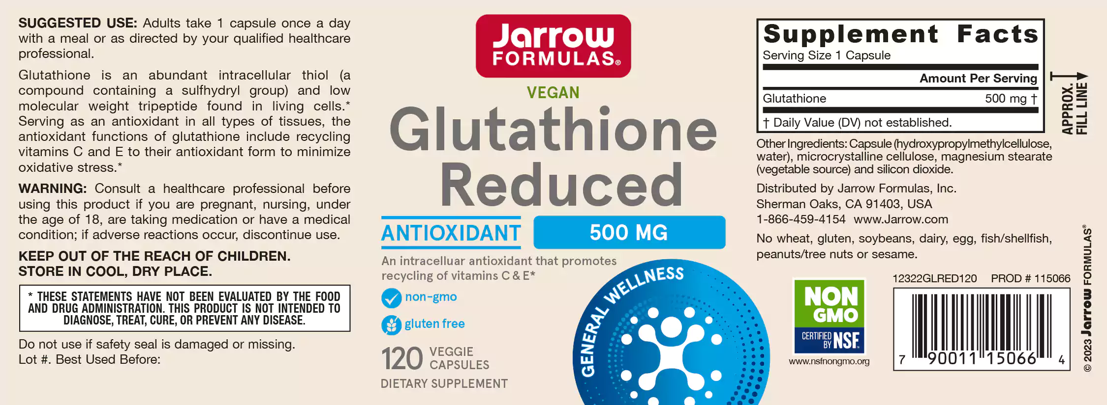 Jarrow Formulas Glutathione Reduced is an ubiquitous antioxidant involved in many cellular functions such as detoxification, amino acid transport, production of coenzymes and recycling of vitamins E and C.