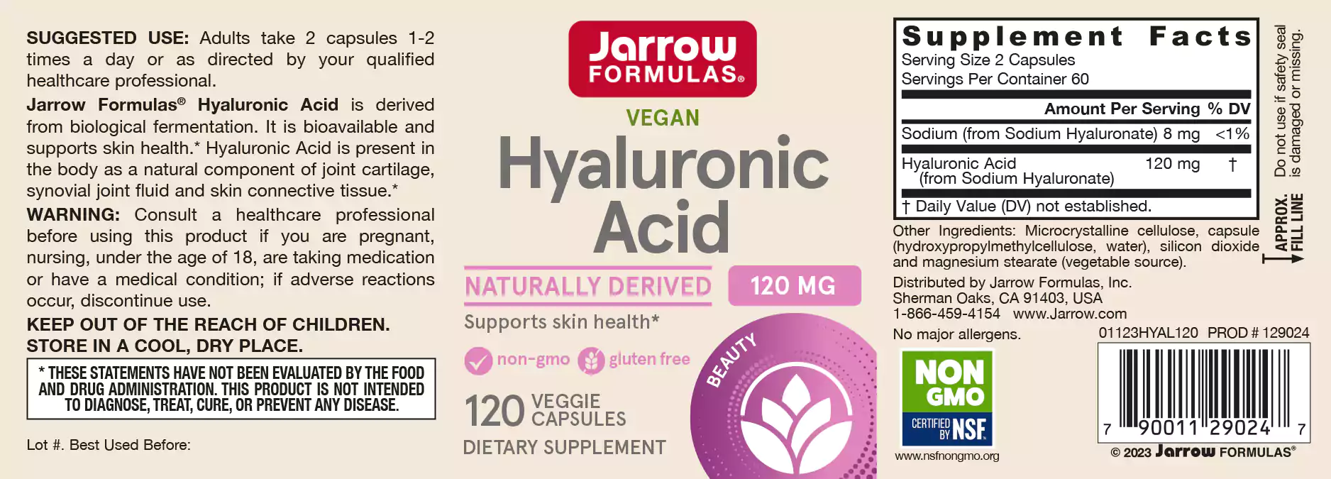 Hyaluronic Acid provides the fluid matrix for joint lubrication, skin hydration, and skin repair. Jarrow Formulas Hyaluronic Acid is a low-molecular weight preparation derived from biological fermentation. It is clinically documented to be bioavailable and to improve hydration of the skin.