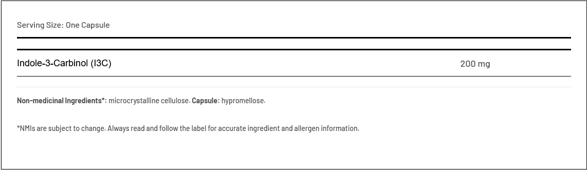 active ingredient (indole-3-carbinol), filler (microcrystalline cellulose), v-capsule (hypromellose)
