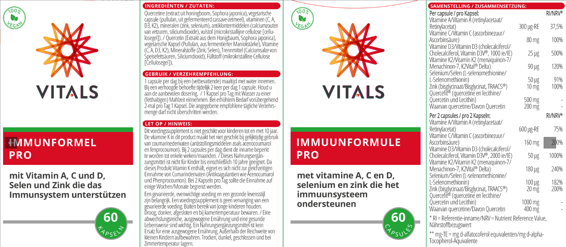 The most well-known function of vitamin K in the body is to contribute to normal blood clotting. Vitamin K activates certain vitamin K-dependent blood clotting factors that ensure optimal blood clotting, ie neither too fast nor too slow. Vitamin K interacts with vitamin D in several ways. It is therefore even better to take these nutrients in combination. There are two types of vitamin K, with vitamin K2 having a broader effect than vitamin K1. Vitamin K2, or menaquinone (abbreviated MK), occurs in various forms. According to the current scientific state of affairs, menaquinone-7 (MK-7) is the most effective form. MK-7 is excellently absorbed and remains in the body for a very long time to be effective, thanks to its long half-life. In Immune Formula Pro, doses of this vitamin have been chosen that have been shown to be effective in human studies. The quality of the vitamin K2 used is also a point of attention. Vitamin K2 is known for being very unstable. In combination with minerals or certain excipients, the vitamin K2 content in a dietary supplement can quickly decrease. This is of course highly undesirable, because you want to be able to store a product for its entire shelf life. The Norwegian producer Kappa Bioscience has developed a vitamin K2 raw material that is very well protected against external influences. By means of a patented micro-encapsulation process, the K2 is completely encapsulated, guaranteeing stability even in products with aggressive mineral compounds. Vitals has selected K2Vital®Delta as the best vitamin K2 raw material after extensive stability tests with various K2 raw materials in various compositions.