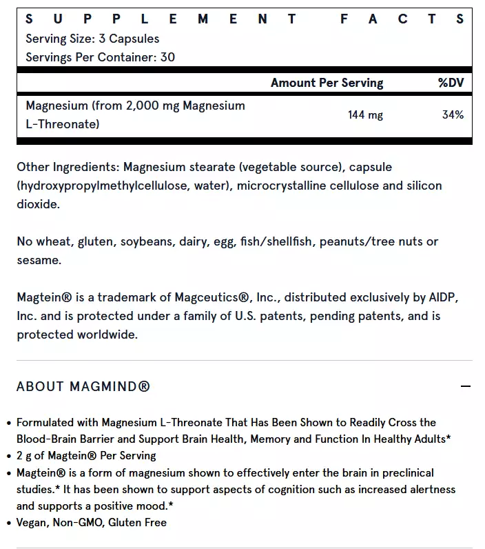 MagMind (magnesium L-threonate, or Magtein) is the only form of magnesium that has been shown by promising research to readily cross the blood-brain barrier and provide significant positive effects on cognition, memory and brain health.