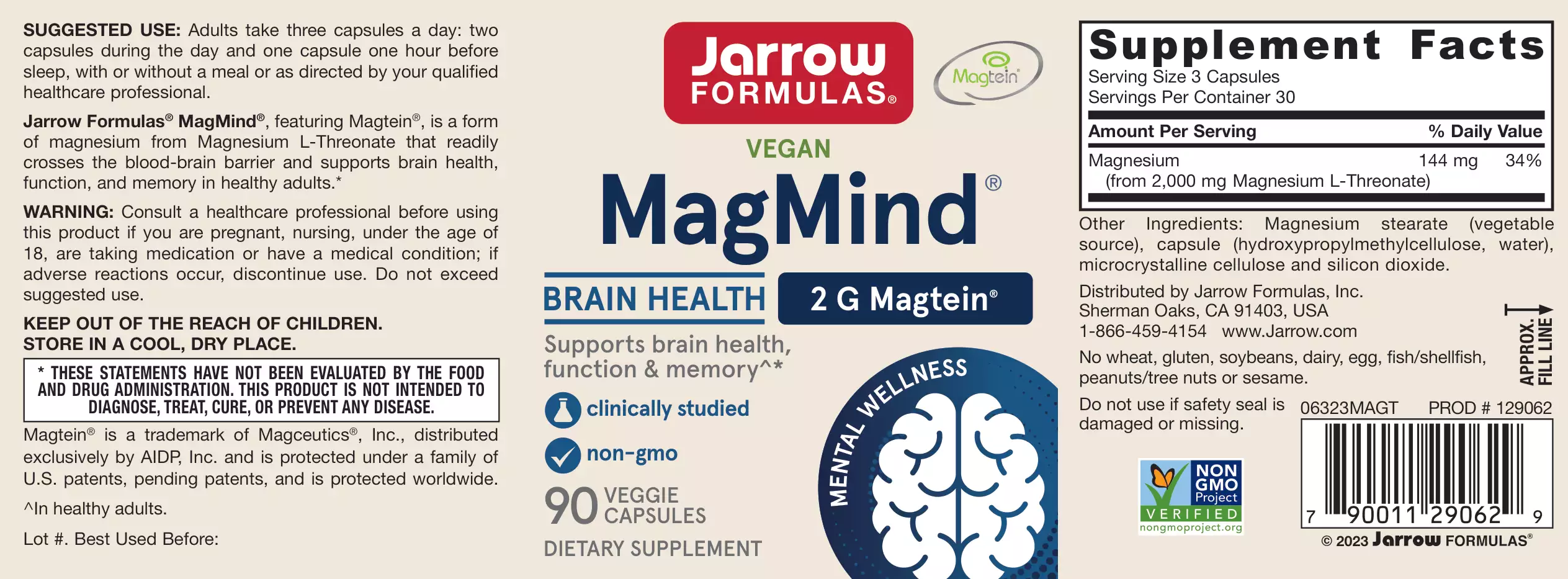 Jarrow Formulas MagMind with magnesium threonate or Magtein is the only form of magnesium that has been shown by promising research to readily cross the blood-brain barrier and provide significant positive effects on cognition, memory and brain health.