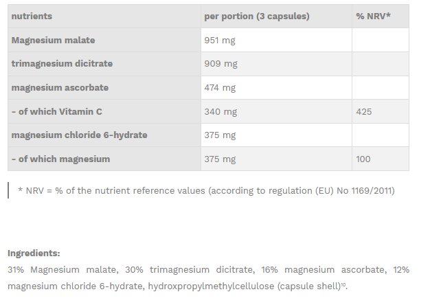 Four different sources of magnesium have been selected - magnesium malate, trimagnesium dicitrate, magnesium ascorbate and magnesium chloride, which differ in terms of bioavailability so that magnesium is available to the body both quickly and in the long term. A portion of 3 capsules covers the complete daily requirement of 375 mg magnesium.