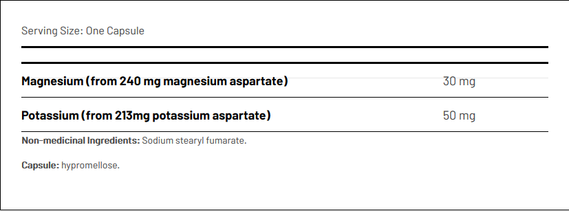 active ingredients (magnesium and potassium aspartate), fillers (microcrystalline cellulose), capsule (hypromellose)