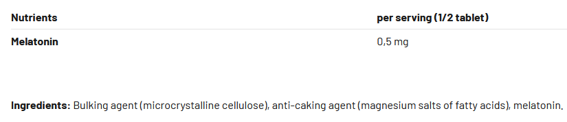 active ingredient (melatonin), filler (microcrystalline cellulose) anticoagulant (magnesium salts of fatty acids)