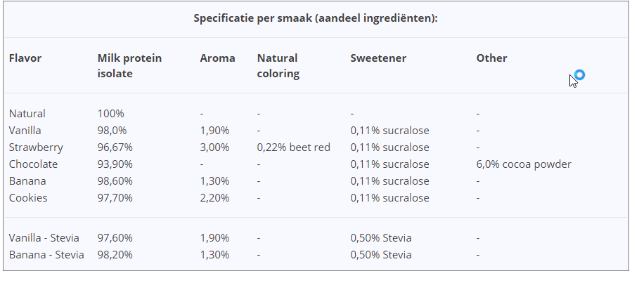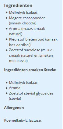 micellar casein (milk), flavour (specific flavour or unflavoured) , sweetener (sucralose or stevia or none in unflavoured)