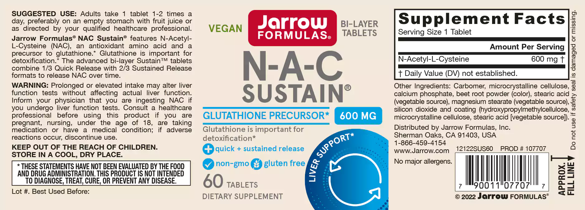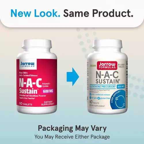 Jarrow Formulas NAC Sustain is in a bilayer Quick Release / Sustained Release format of N-Acetyl-L-Cysteine (NAC). N-Acetyl L-Cysteine, a sulfur amino compound which plays an all important role in the production of the body dominant and essential antioxidant Glutathione. Optimal Glutathione levels are important for a healthy immune system and the cell defense against viral infections.