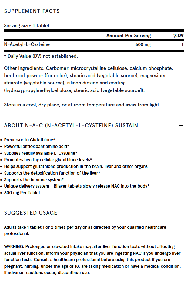 NAC Sustain is a bilayer Quick Release/Sustained Release N-A-C formulation. One third of the N-A-C releases rapidly and two thirds releases slowly over time. This raises blood levels quickly while also sustaining them.