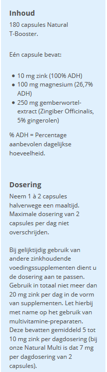 Each two capsules of Natural T-Booster contains ample amounts of zinc (20mg), magnesium (200mg) and a standardized ginger extract (500mg)