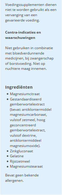 active ingredients (ginger root extract, magnesium citrate, zinc gluconate), filler (rice starch, magnesium stearate), capsule (bovine gelatin)