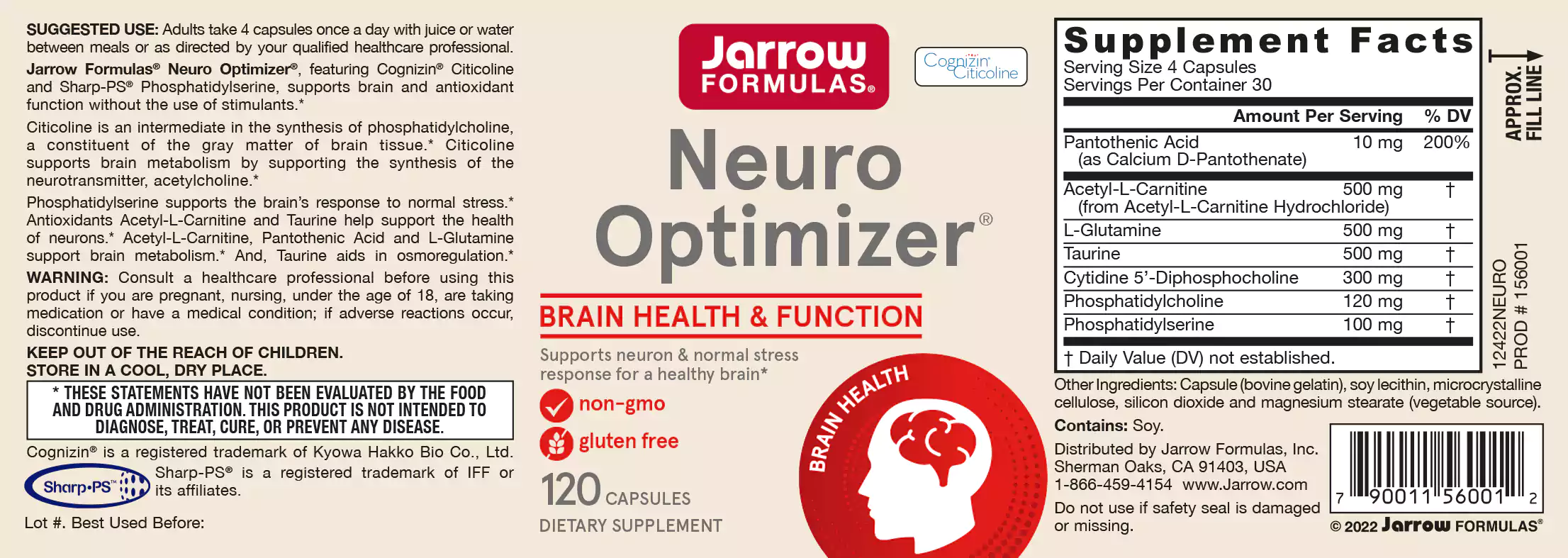 Jarrow Formulas Neuro Optimizer 120 capsules contains seven nutrients (citicoline, phosphatidylserine, alpha lipoic acid, acetyl L-carnitine, L-glutamine, taurine and phosphatidylcholine) to build and protect nerve membranes, prevent free radical damage, enhance brain metabolism and provide stable energy.