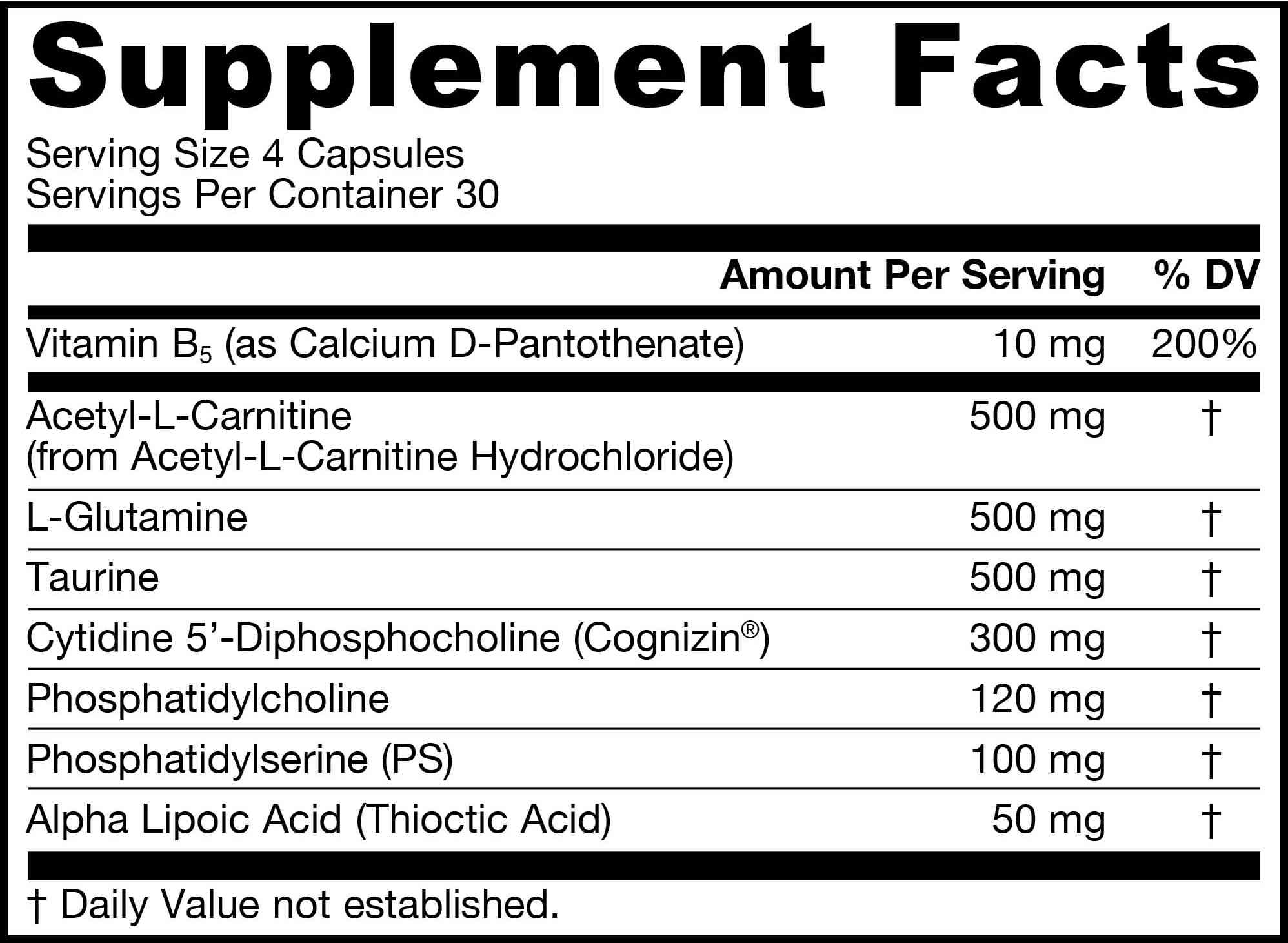 active ingredients (acetyl-carnitine, glutamine, taurine, phospholipids, alpha lipoic acid), filler (soy lecithin, cellulose, vegetable magnesium stearate), anti-coagulant (silicon dioxide), capsule (BSE-free bovine gelatin)