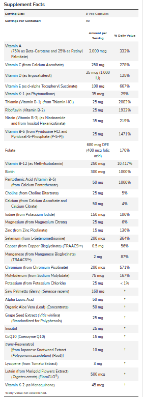 werkzame stoffen (vitaminse, mineralen, zaagbladpalmbes, alfaliponzuur, biologische aloe vera, druivepitextract, co-enzymQ10, transresveratrol, lycopeen, luteïne), vulstof (microkristallijne cellulose), v-capsule (hypromellose), vulstof (plantaardig stearinezuur), antiklontermiddel (siliciumdioxide)