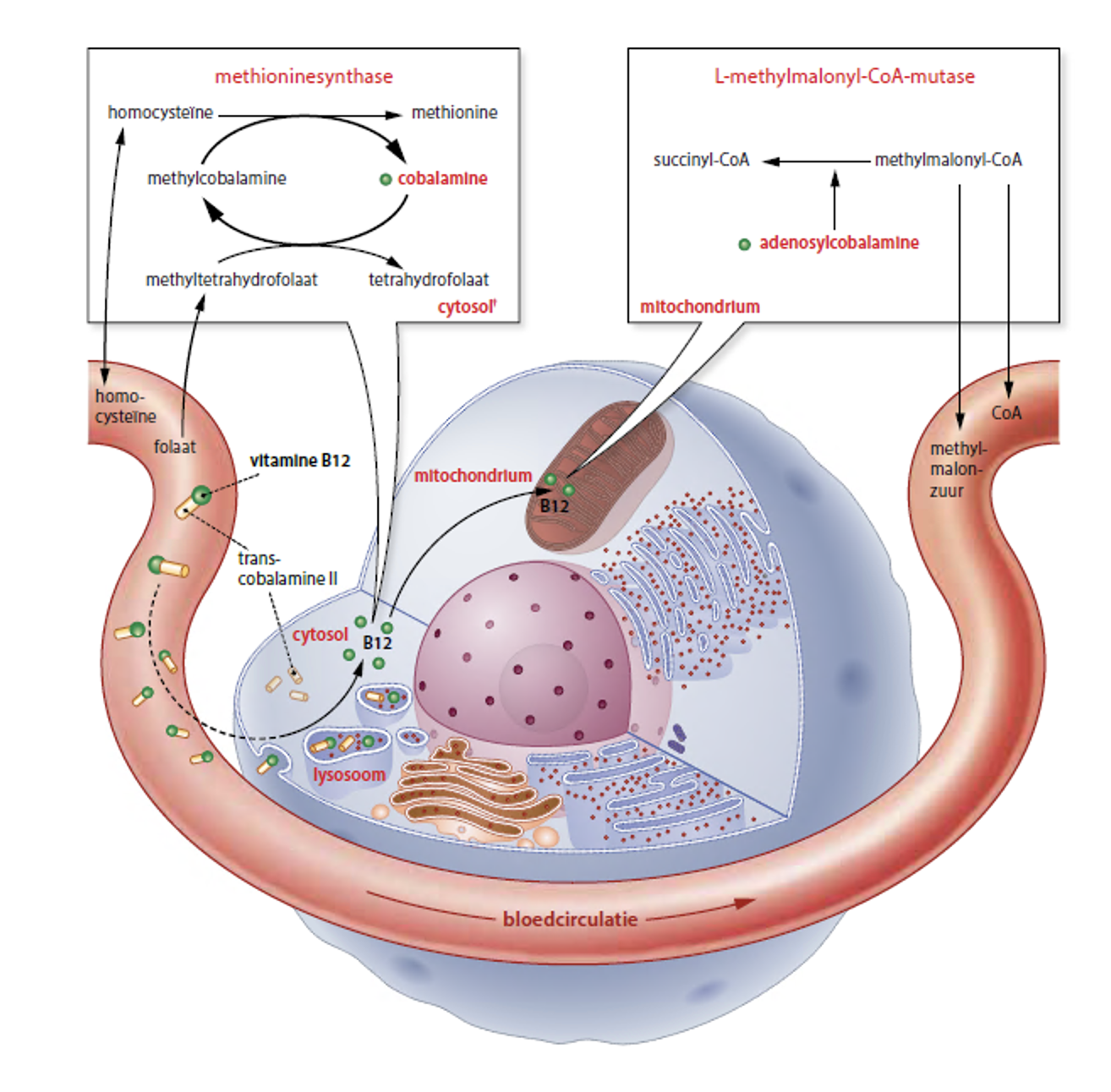 In het bloed is 20-25% van vitamine B12 gebonden aan transcobalamine II. Alleen vitamine B12 dat aan dit eiwit is gekoppeld wordt in de lichaamscellen opgenomen (zie figuur 2). In de lysosomen van de cel wordt de vitamine B12 losgemaakt van transcobalamine II en omgezet in methyl- of adenosylcobalamine. (Lysosomen zijn blaasjes in het cytoplasma waarin bepaalde stoffen afgebroken worden om hergebruikt of uitgescheiden te worden.) Methylcobalamine is vooral in het bloedplasma, cytoplasma en hersenvocht nodig, terwijl adenosylcobalamine in de weefsels en mitochondriën nodig is.