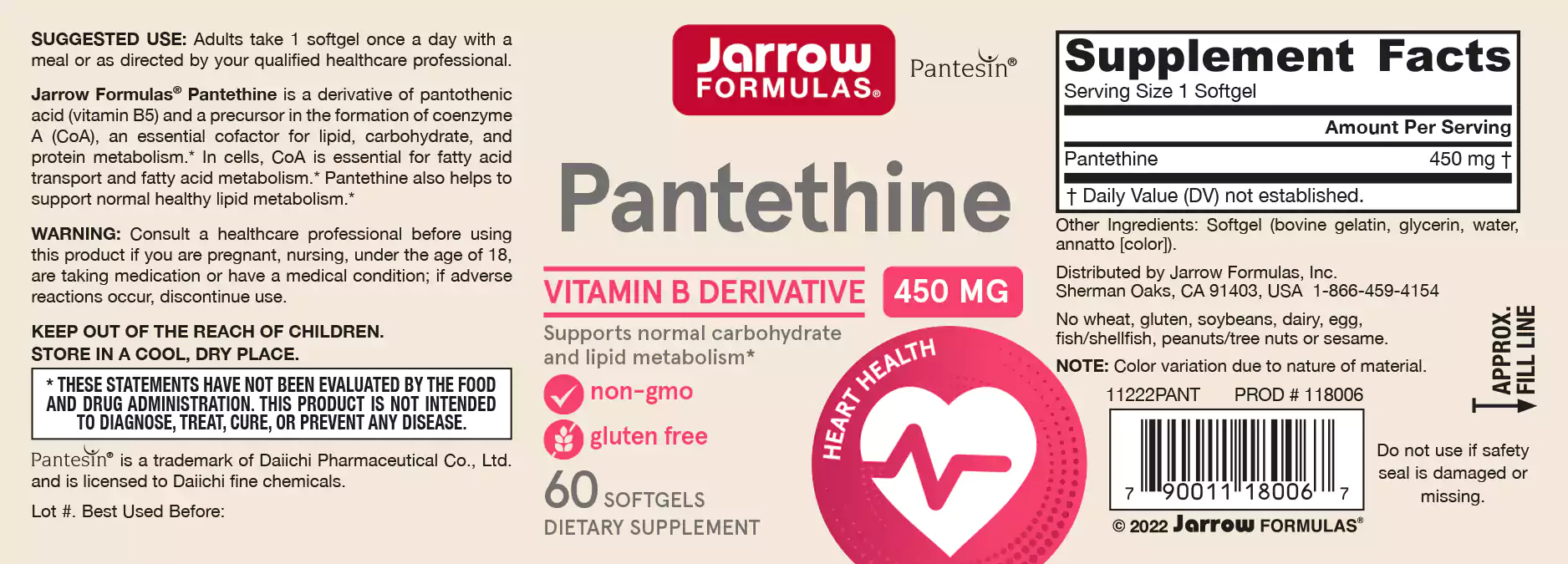 Jarrow Formulas Pantethine helpt het cholesterolgehalte te verlagen, verbetert de balans tussen HDL en LDL cholesterol, bevordert de bloedsomloop, verhoogt de energieproductie in spiercellen en bevordert haargroei en -reparatie.