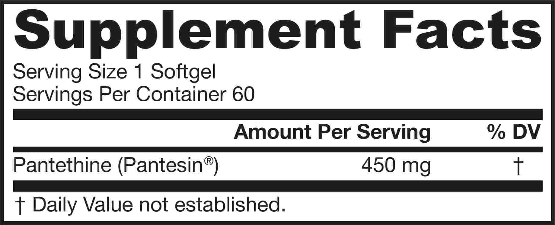 Pantethine is een derivaat van vitamine B5. Pantethine ondersteunt het lipidenmetabolisme door zijn vermogen om de CoA-niveaus te verhogen, een cofactor die betrokken is bij verschillende metabolische routes, waaronder het koolhydraat- en lipidenmetabolisme. CoA combineert met acetylgroepen om Acetyl CoA te vormen, een deelnemer aan de energieproductie.