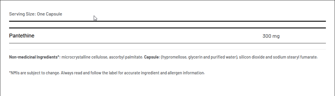 werkzame stof (pantethine), vulstof (microkristallijne cellulose, ascorbylpalmitaat), V-capsule (hypromellose, glycerine en gezuiverd water), anticoagulans (siliciumdioxide), vulstof (natriumstearylfumaraat)